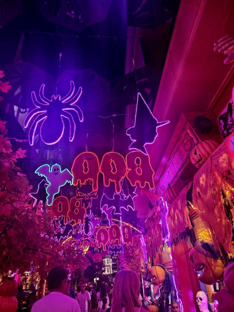 The moment we turned onto Karaiskaki Street, we knew we had found something special. Entire streets were decked out in elaborate Halloween decorations — pumpkins, cobwebs, witches, and skeletons hung overhead, spilling out from the café itself into the surrounding area. It wasn’t just one building; the whole block felt transformed.